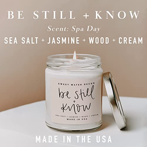 Sweet Water Decor, Be Still and Know, Sea Salt, Jasmine, Cream, and Wood Scented Soy Wax Candle for Home | 9oz Clear Jar, 40 Hour Burn Time, Made in the USA